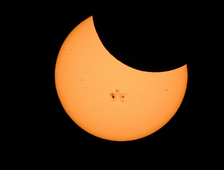 Coincidentally, the giant sunspot region known as AR 12192 (seen as the irregular darker region near the center of the sun) was the largest seen in 24 years.